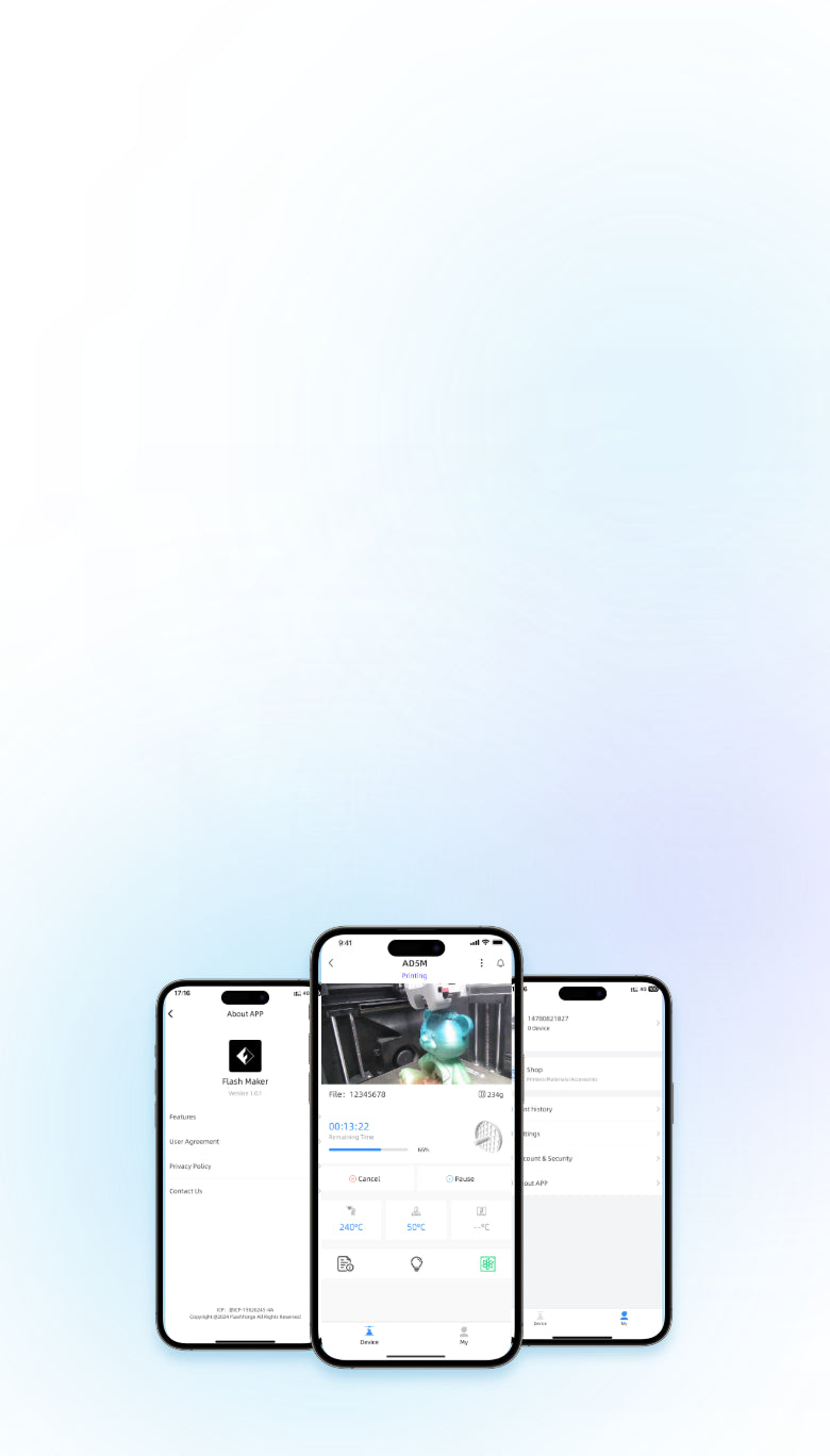無需綁定印表機,綁定一台或多台3D列印機即可隨時隨地查看即時更新,包括列印進度和材料詳細信息